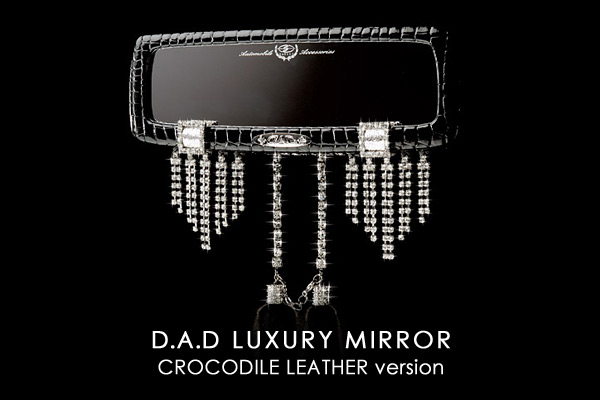 ファッション性と機能性を両立した真のラグジュアリースタイルに合うルームミラー。ブラッククロコダイル合成皮革の本体にスワロフスキー社のクリスタルバックルを配した