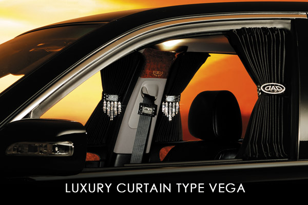 日除け、車内のプライバシー保護などに人気のギャルソン・DADの車用カーテン。タッセル部分には艶のあるクロームコーティングを施し、D.A.Dロゴ の刻印をあしらったエグゼクティブ感溢れるオーナメントプレートを配し、洗練された斬新さとこの上ない上質感を醸し出します。