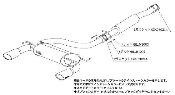 エレガントなテールを演出するために作られたモデルのノーブルシリーズマフラー。オーバル形状のテール部分にはスワロフスキークリスタルエンブレムプレートを配し、ハイクラスの高級感を演出するリアテールマフラー。