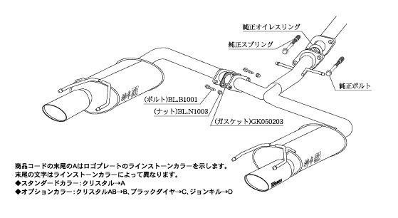 エレガントなテールを演出するために作られたモデルのノーブルシリーズマフラー。オーバル形状のテール部分にはスワロフスキークリスタルエンブレムプレートを配し、ハイクラスの高級感を演出するリアテールマフラー。