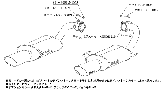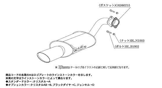 エレガントなテールを演出するために作られたモデルのノーブルシリーズマフラー。オーバル形状のテール部分にはスワロフスキークリスタルエンブレムプレートを配し、ハイクラスの高級感を演出するリアテールマフラー。