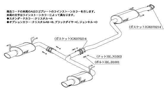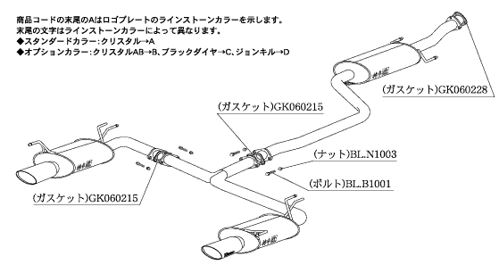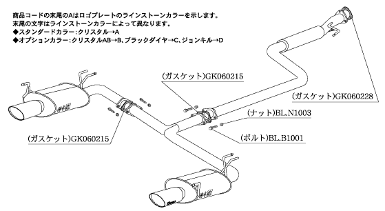 エレガントなテールを演出するために作られたモデルのノーブルシリーズマフラー。オーバル形状のテール部分にはスワロフスキークリスタルエンブレムプレートを配し、ハイクラスの高級感を演出するリアテールマフラー。