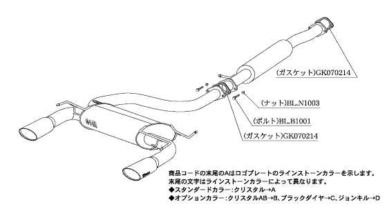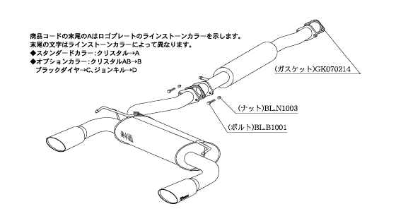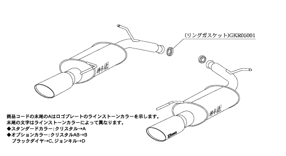 エレガントなテールを演出するために作られたモデルのノーブルシリーズマフラー。オーバル形状のテール部分にはスワロフスキークリスタルエンブレムプレートを配し、ハイクラスの高級感を演出するリアテールマフラー。