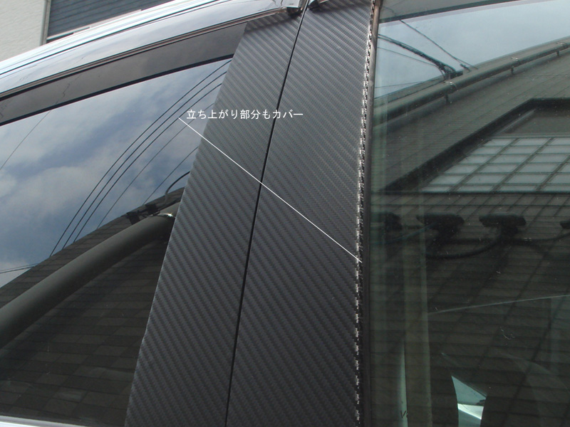 綾織カーボンのリアルな質感のピラーに合わせた専用カット済みのフィルムを上から貼るだけの工程で、手軽にカーボンピラー仕様になります。