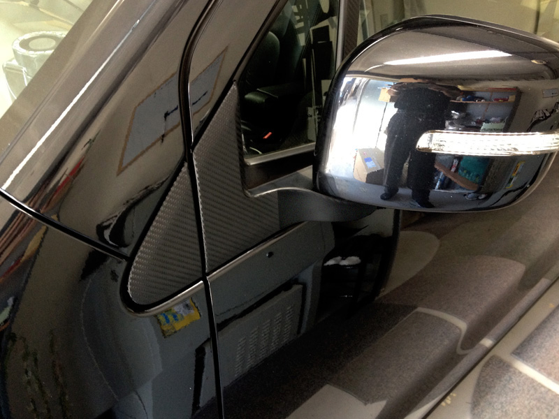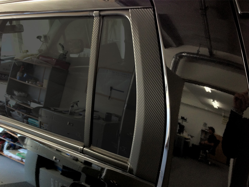 綾織カーボンのリアルな質感のピラーに合わせた専用カット済みのフィルムを上から貼るだけの工程で、手軽にカーボンピラー仕様になります。