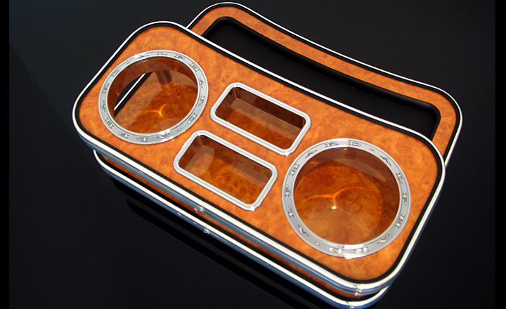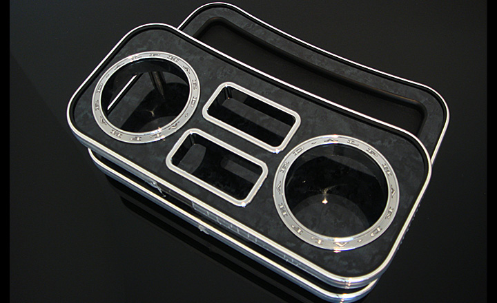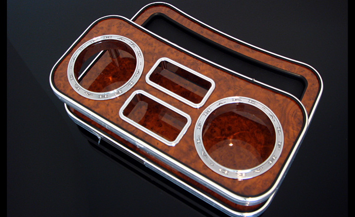 人気パーツの助手席用フロントテーブルと同じようなテーブルを中央に設置するセンターテーブル。純正センターコンソールのトレー部に差し込み両面テープ貼付けの簡単設置で、木目またはピアノブラックとクロームリングのコンビで高級感を中央に与えます。フロントテーブルと異なり、車検も問題ありません。