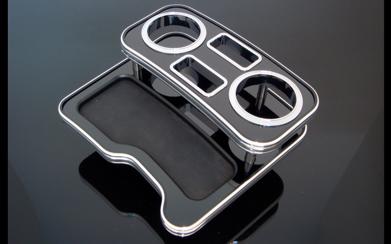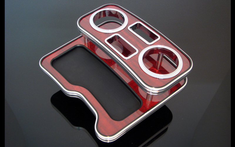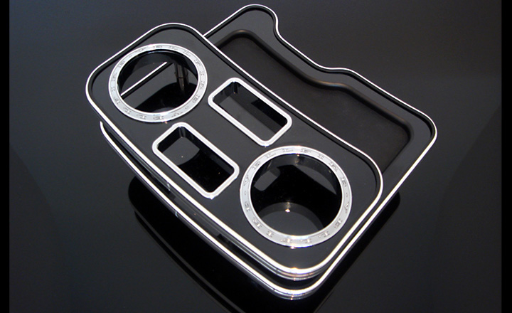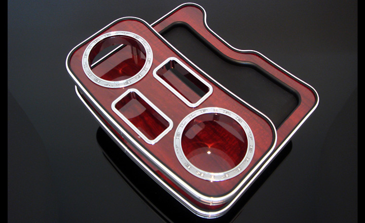 人気パーツの助手席用フロントテーブルと同じようなテーブルを中央に設置するセンターテーブル。純正ドリンクホルダー部に差し込むだけの簡単設置で、木目またはピアノブラックとクロームリングのコンビで高級感を中央に与えます。フロントテーブルと異なり、車検も問題ありません。