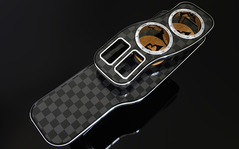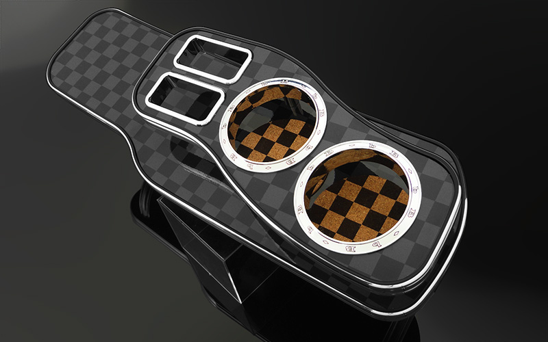 - コースターデザインは車名ロゴとチェック柄を用意。ご希望のタイプを選べます。(写真左:ロゴタイプ)(写真右:チェック柄)