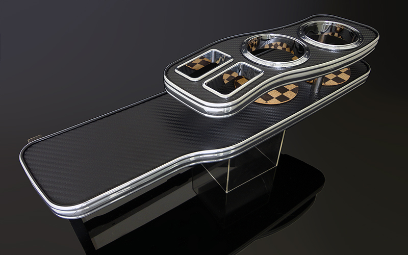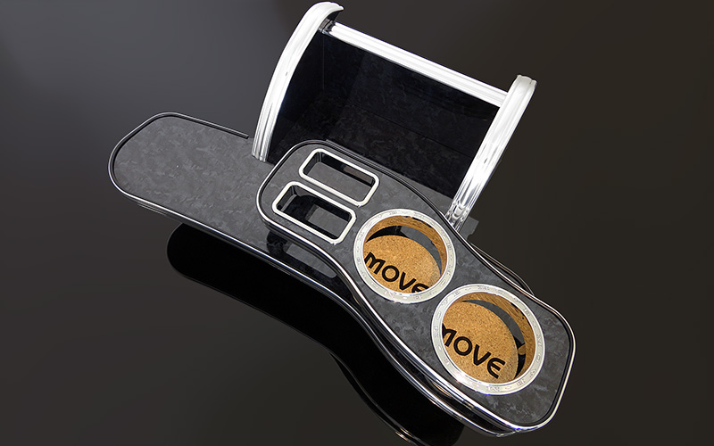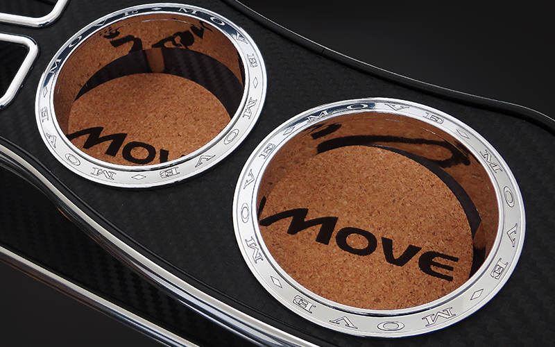 人気パーツの助手席用フロントテーブル。定番中の定番アイテムですが、ドリンクホルダーリング部分のデザインを販売元のメーカーロゴなどで装飾せずに車種名のムーヴ文字を入れることでブランドに拘っている感を払拭。オーナーしかわからないブランド名ではなく、誰もがわかるムーヴで印象を高めるフロントテーブルです。