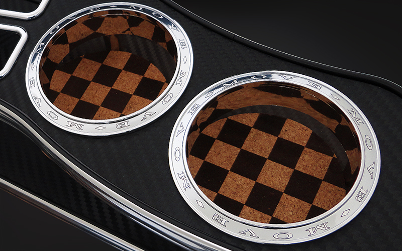 - コースターデザインは車名ロゴとチェック柄を用意。ご希望のタイプを選べます。(写真左:ロゴタイプ)(写真右:チェック柄)