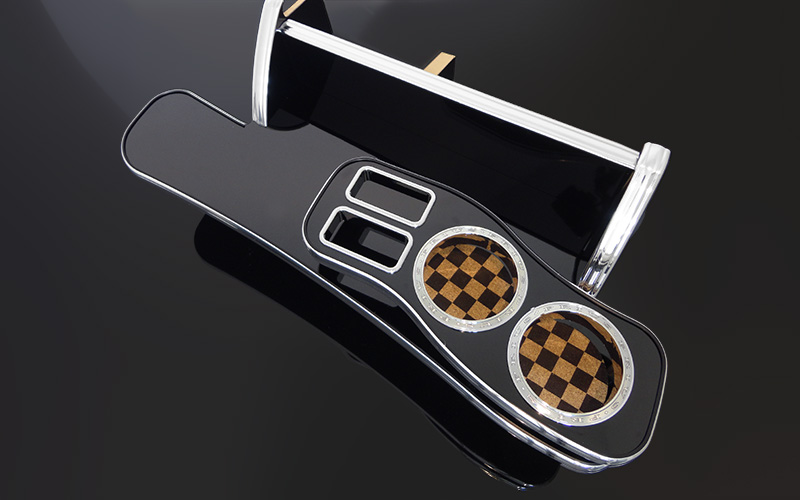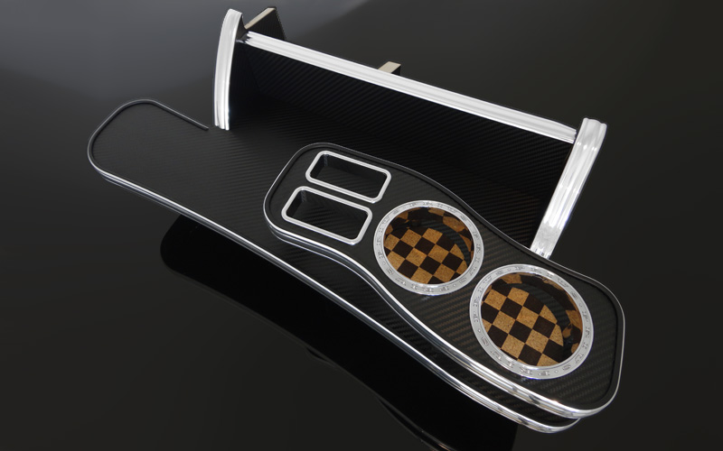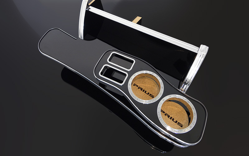 人気パーツの助手席用フロントテーブル。定番中の定番アイテムですが、ドリンクホルダーリング部分のデザインを販売元のメーカーロゴなどで装飾せずに車種名のプリウス文字を入れることでブランドに拘っている感を払拭。オーナーしかわからないブランド名ではなく、誰もがわかるプリウスで印象を高めるフロントテーブルです。